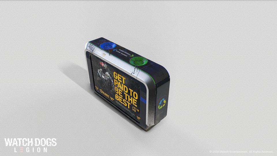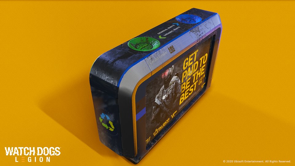 Trash Bin prop for Watchdogs : Legion, It was fun to create this little guy. Concept done by our concept team, I was responsible for the creation of the model and textures.